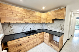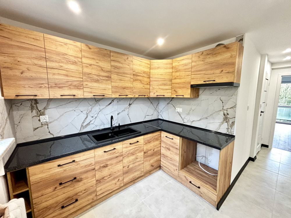 Kuchnia nowoczesna i przestronna, wyposażona w nowe meble kuchenne ze sprzętem AGD. Duża ilość szafek zapewnia sporo miejsca do przechowywania