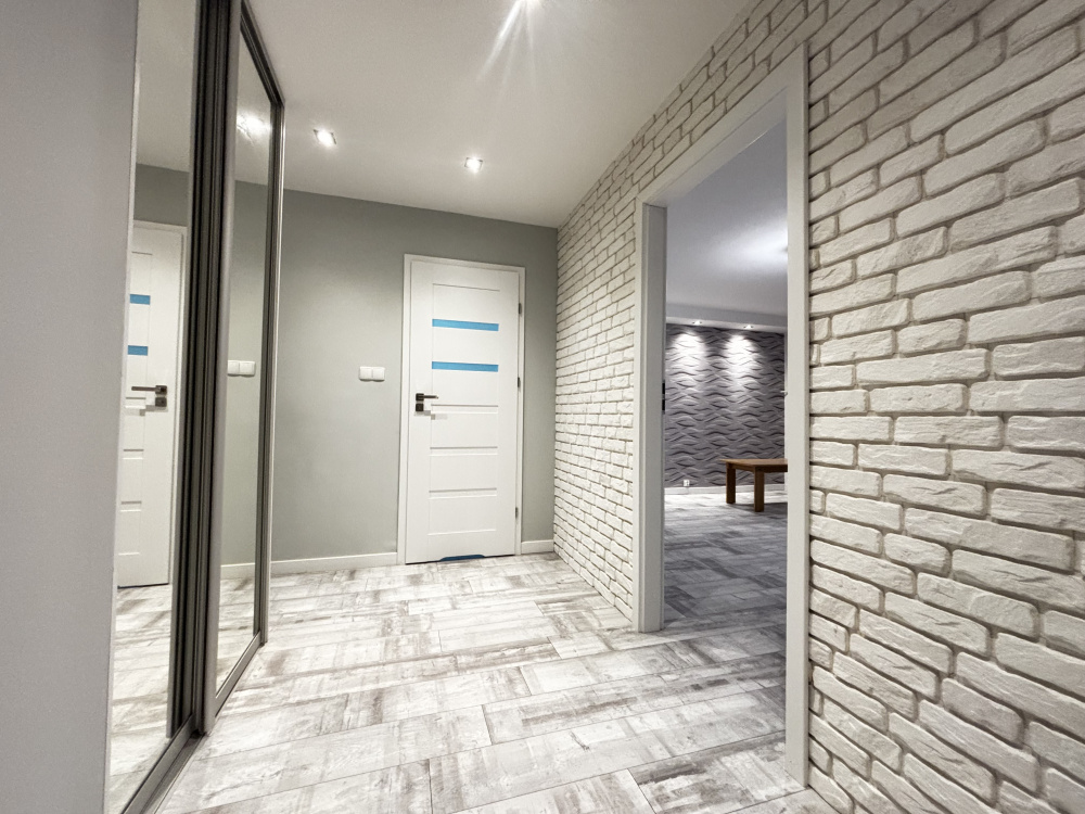 Przedpokój przestronny, z szafą wnękową z lustrzanymi drzwiami, powiększającymi optycznie przestrzeń.