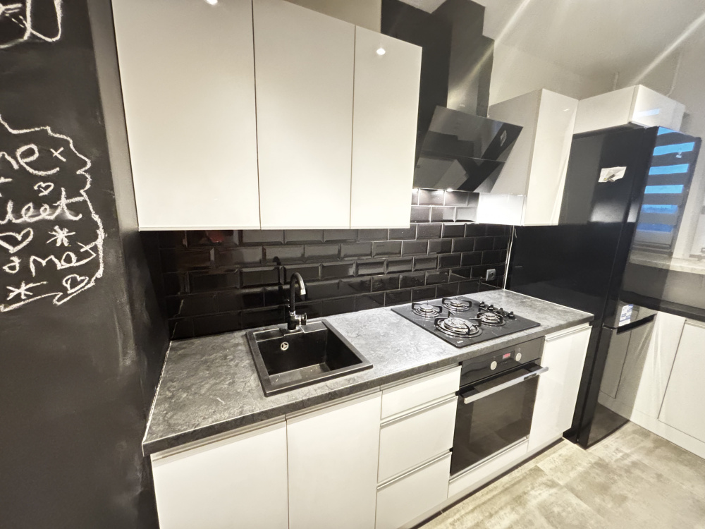Kuchnia nowoczesna i przestronna, wyposażona w nowe meble kuchenne ze sprzętem AGD. Duża ilość szafek zapewnia sporo miejsca do przechowywania