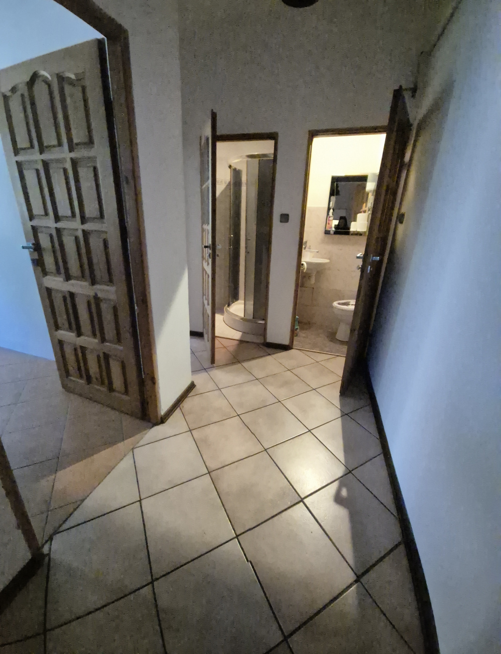 Druga część mieszkania z wejściem od klatki schodowej: pokój, kuchnia, przedpokój, łazienka z WC.