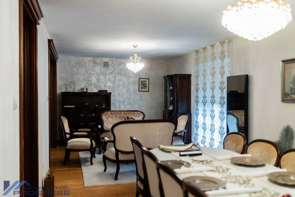 Dom utrzymany w bardzo dobrym stanie technicznym, mieszkania na bieżąco remontowane, parter nie wymaga nakładów, piętro do odświeżenia. Materiały dobrej jakości, okna PCV, podłogi w pokojach drewniane, w kuchni i łazienkach płytki ceramiczne, na ścianach gładzie i płytki.W piwnicach znajdują się 2 pomieszczenia, dodatkowa toaleta, spiżarka i garaż, we wcześniejszych latach w jednym z pomieszczeń funkcjonował gabinet dentystyczny, gdzie doprowadzone zostały dodatkowe wymagane instalacje.Nad całą powierzchnią budynku strych doświetlony oknem dachowym, na dachu blacha płaska w dobrym stanie.