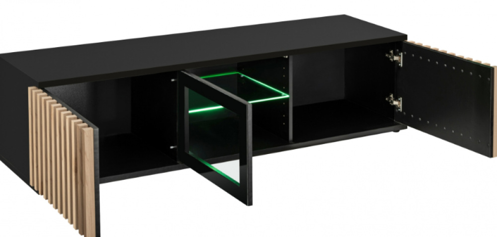 Sprzedam nową, nieużywaną szafkę RTV z nowoczesnymi frontami(drewniane lamele)+ oświetlenie półki szklanej GRATIS Długość szafki 163 cm. RTV Cameron została zmontowana tylko na potrzeby zdjęć aranżacyjnych. Cena katalogowa ok.1200 zł. Możliwość domówienia innych pozycji z kolekcji Cameron. Odbiór osobisty w Jedliczu lub możliwy transport. Produkt polski!!!