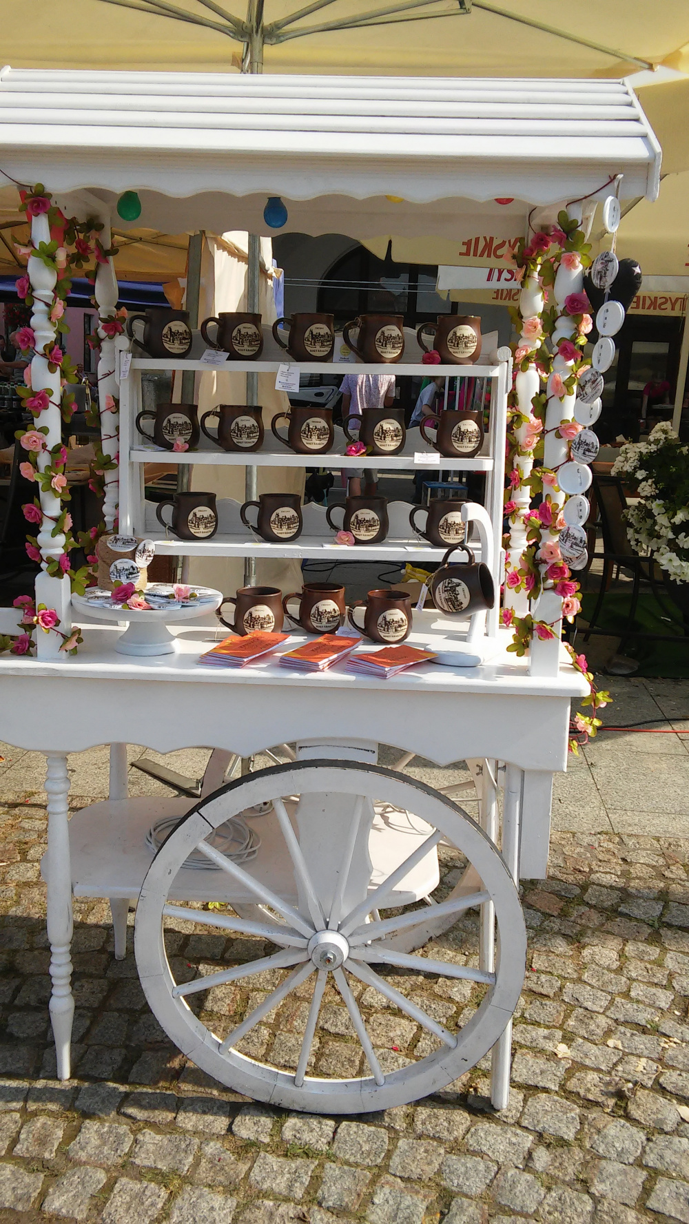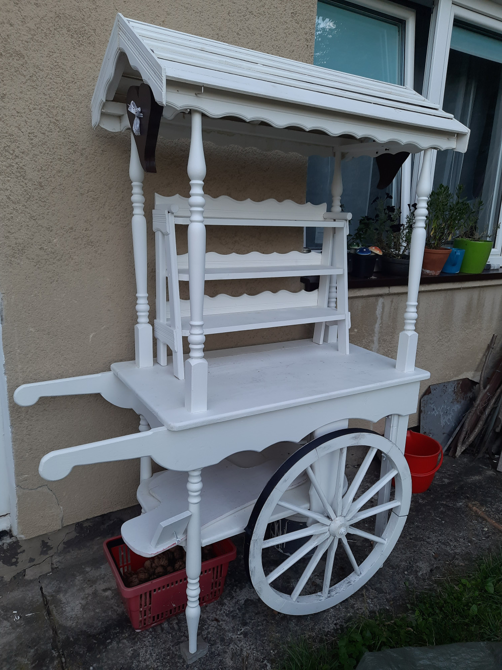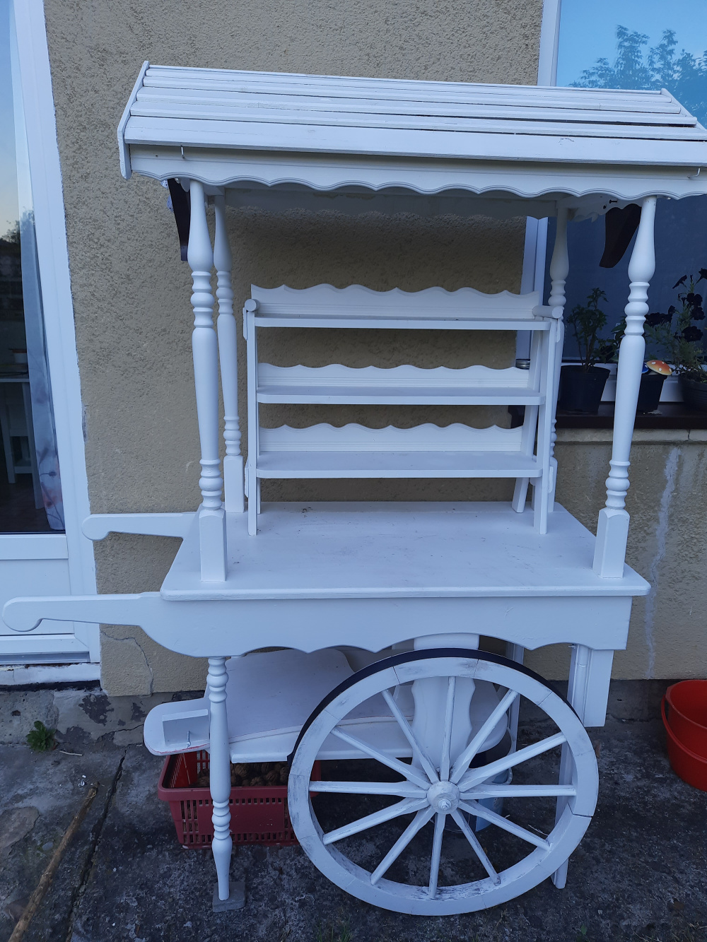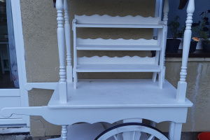 Sprzedam biały drewniany wóz z dużymi kołami nadający się na dekoracje weselne, pikniki, festyny, idealnie nadaje się pod dom jako np. słodki stół, eksponowania słodyczy, ciast, kwiatów lub innych elementów dekoracyjnych.