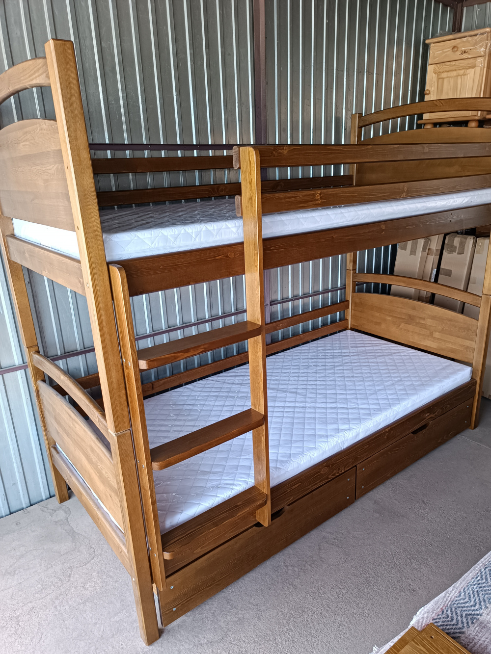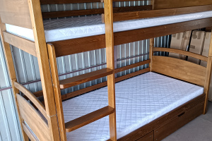 Przedmiotem sprzedaży jest łóżko piętrowe dwuosobowe, wykonane z bardzo dobrej jakości drewna sosnowego w wymiarach materacy 90 x 200. Łóżko wykonane bardzo masywnie boki osadzone na kołkach i skręcane śrubami. Podana cena jest ceną całego kompletu wraz z materacami piankowymi, oraz szufladami.