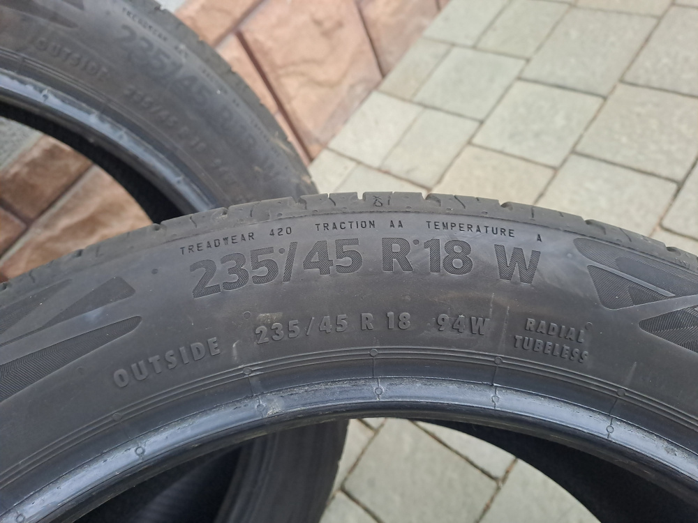 Sprzedam komplet opon letnich Continental EcoContact6 235/45 R18 z 2024r jeżdżone mało przez jeden sezon - stan wzorowy. Zdjęte z passata z powodu zmiany felg i opony w tym rozmiarze mi już nie potrzebne.
