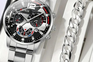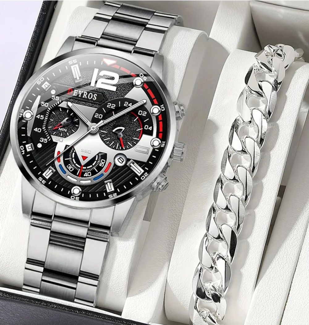 Do sprzedania nowy męski zegarek kwarcowy , kolor srebrny z bransoletką ze stali nierdzewnej, o długości 23.5 cm wraz (w komplecie) bransoletką metalową na rękę (metal) męską