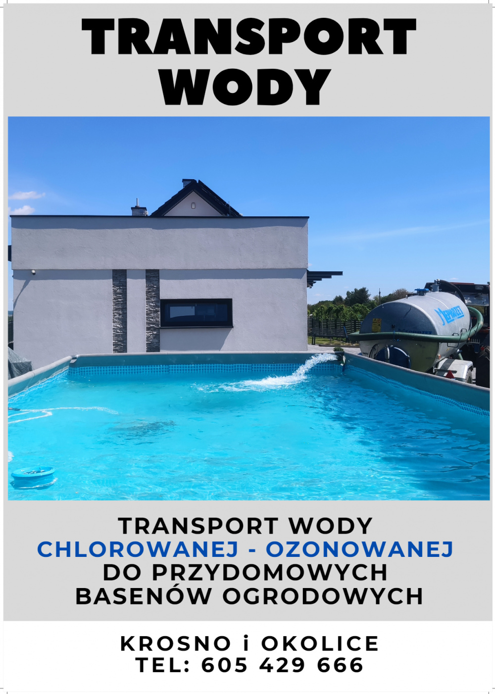Oferujemy transport wody chlorowanej - ozonowanej do przydomowych basenów ogrodowych, pojemność beczkowozów 5000 litrów. Cena uzależniona od lokalizacji. Krosno i okolice. Informacje w wiadomości prywatnej lub telefonicznie pod numerem