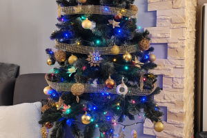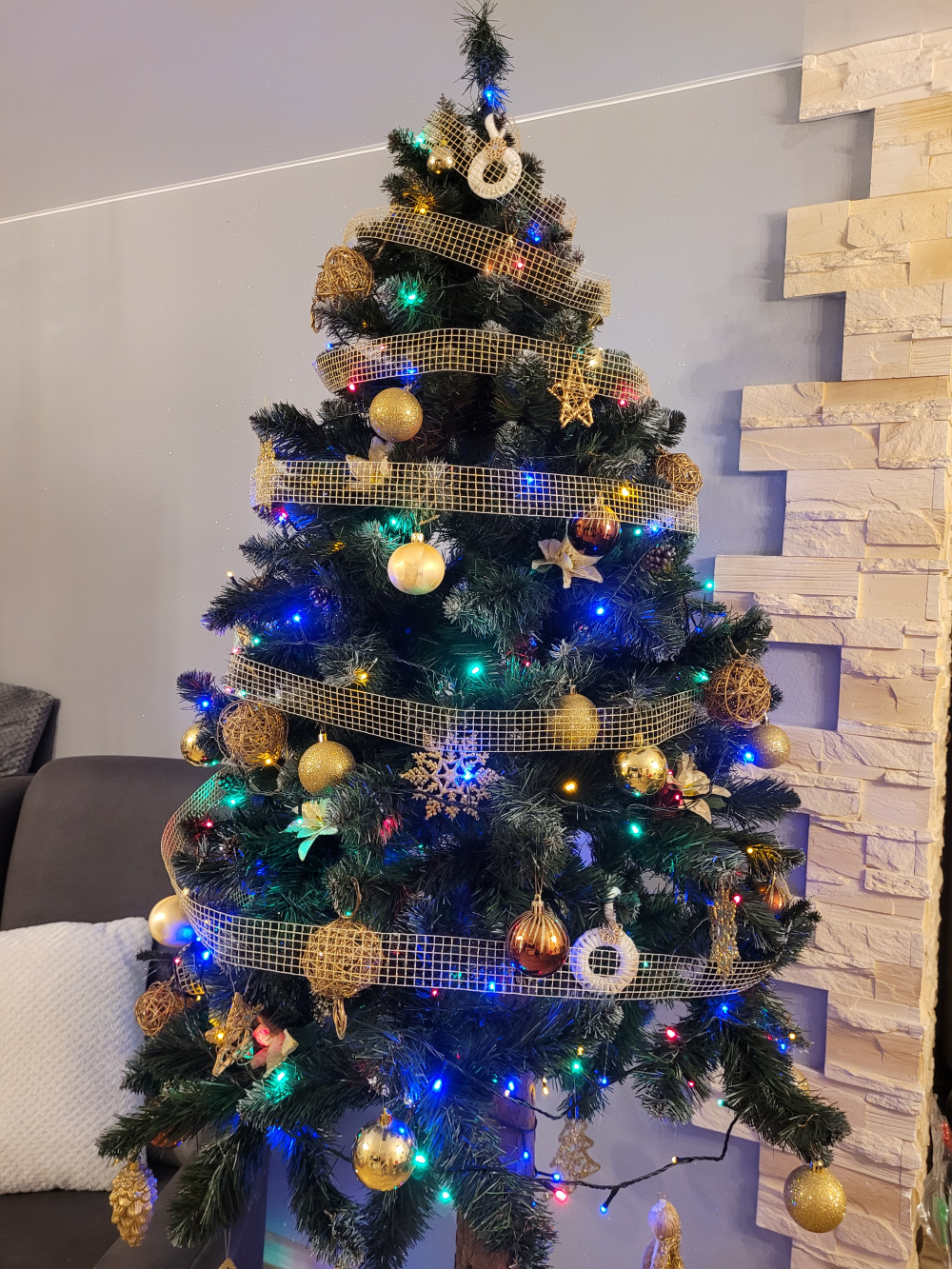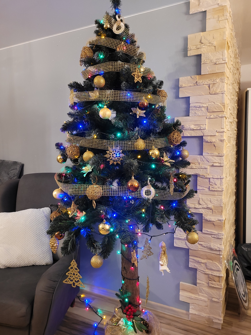 1. Gotową ubraną choinkę na pniu o wysokości ok 2.2m z kolorowymi światełkami na długim kablu -300zl do negocjacji.