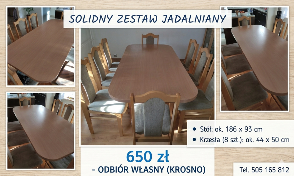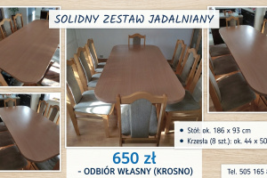 Sprzedam solidny zestaw mebli do jadalni lub salonu. Meble są zadbane i gotowe do użytku. W skład zestawu wchodzi duży stół oraz komplet 8 wygodnych krzeseł.