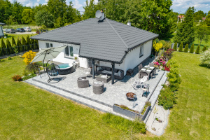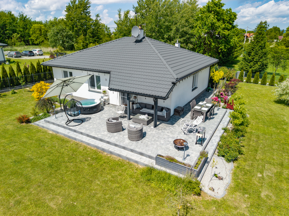 Zaletą nieruchomości jest ogród - całość otoczenia domu osłonięta jest roślinnością pozwalającą zachować komfort odpoczynku na dużym tarasie. Teren wokół budynku wykończony został częściowo kostką brukową.