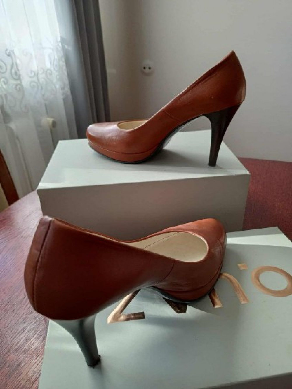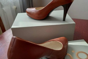 Sprzedam czółenka skórzane koloru brązowego na platformie (2 cm) w rozmiarze 40 . Wysokość obcasa 10 cm. Stan idealny.