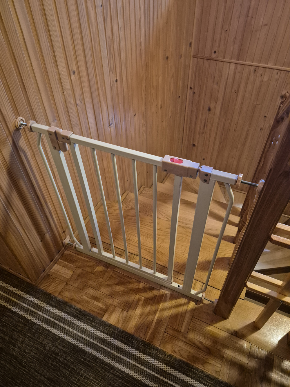 Bramka zabezpieczająca na schody. Używana. Szerokość 72 - 82 cm. Wysokość 76 cm. Metalowa, kolor jasny kremowy. Łatwy bezinwazyjny montaż. Odbiór osobisty Jedlicze.