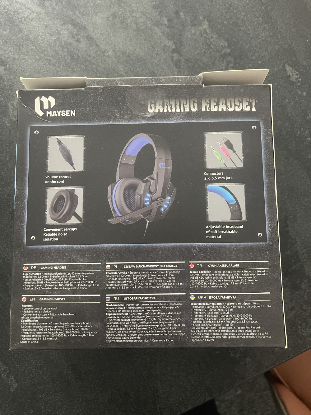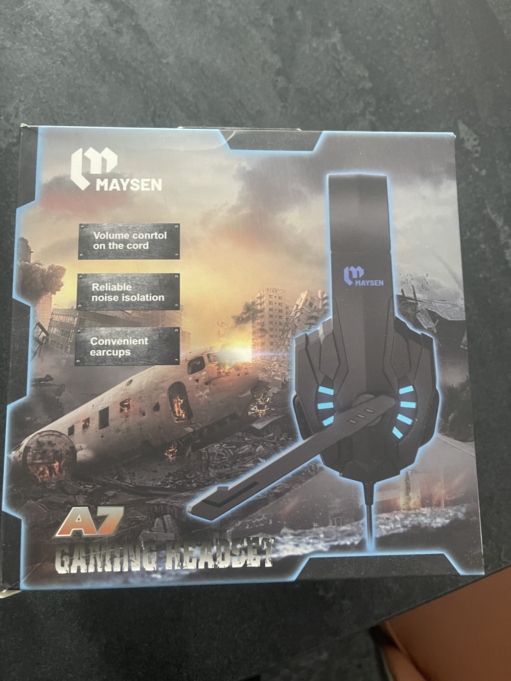 Słuchawki Maysen A7 to stereofoniczne, ładnie podświetlane słuchawki dla gracza z mikrofonem na pałąku z regulatorem głośności i włącznikiem/wyłącznikiem mikrofonu oraz uniwersalnym złączem 2xJACK pasującym do konsol XBOX One, Playstation 4 jak i większości urządzeń. Słuchawki nowe.