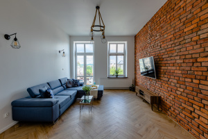 - Renowację oryginalnej cegły w salonie, która nadaje wnętrzu unikalny styl