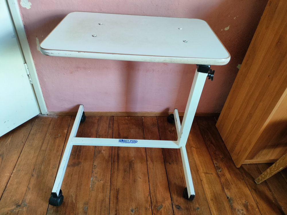 Sprzedam używany stolik dla osoby niepełnosprawnej, posiada ślady użytkowania widoczne na zdjęciach. Poduszki przeciwodleżynowe były użyte kilka razy, są w stanie bardzo dobrym. Pokrowce są zdejmowane, można odświeżyć.