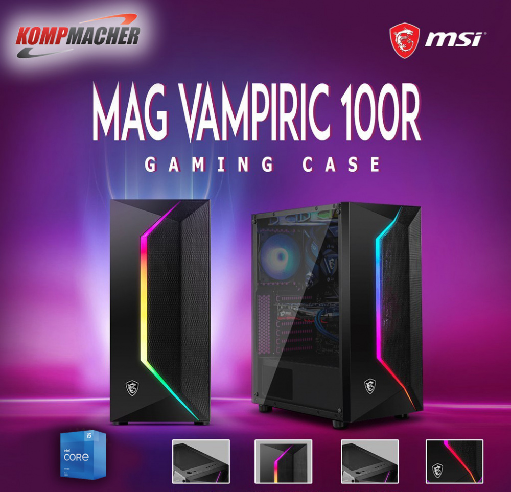 Wszystko zamknięte w przepięknej markowej obudowie MSI Vampiric z wentylatorem LED RGB oraz przeszkoloną boczną ścianką (szkło hartowane + 2 wentyllatory).