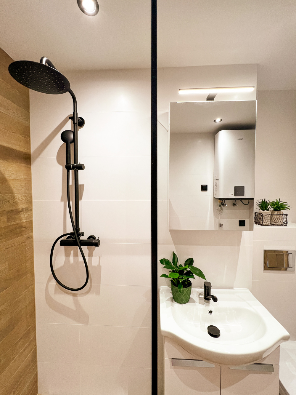 Łazienka została wykończona w wysokim standardzie – znajduje się w niej nowoczesna kabina prysznicowa typu walk-in oraz praktyczne rozwiązania zapewniające komfort codziennego użytkowania.