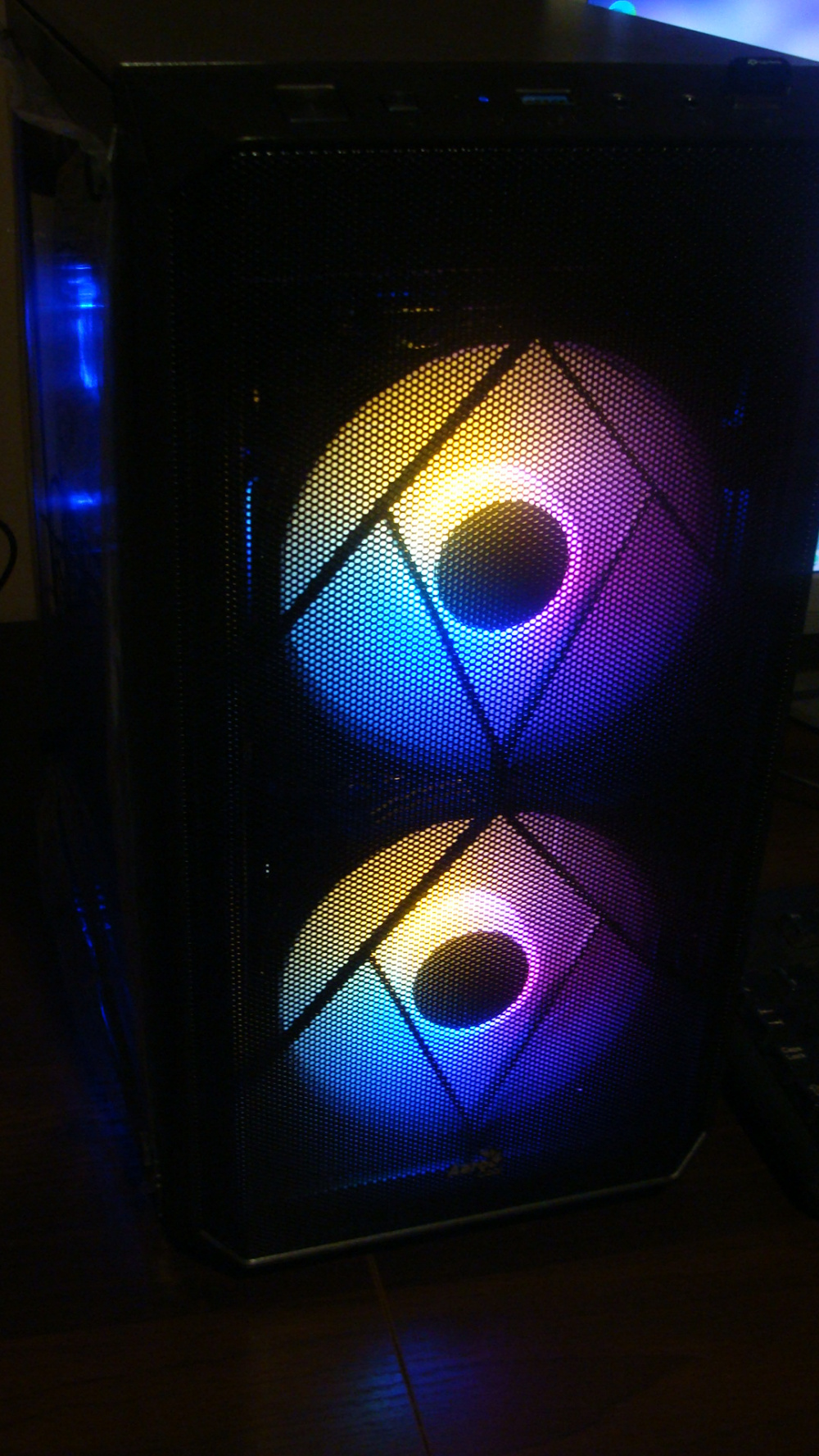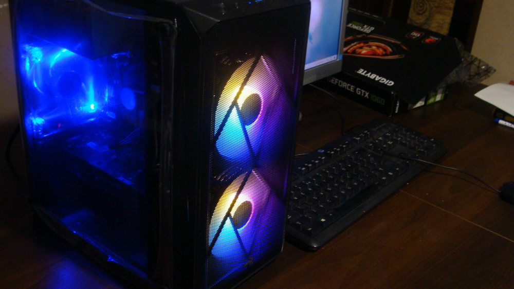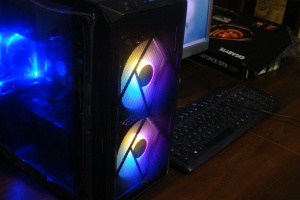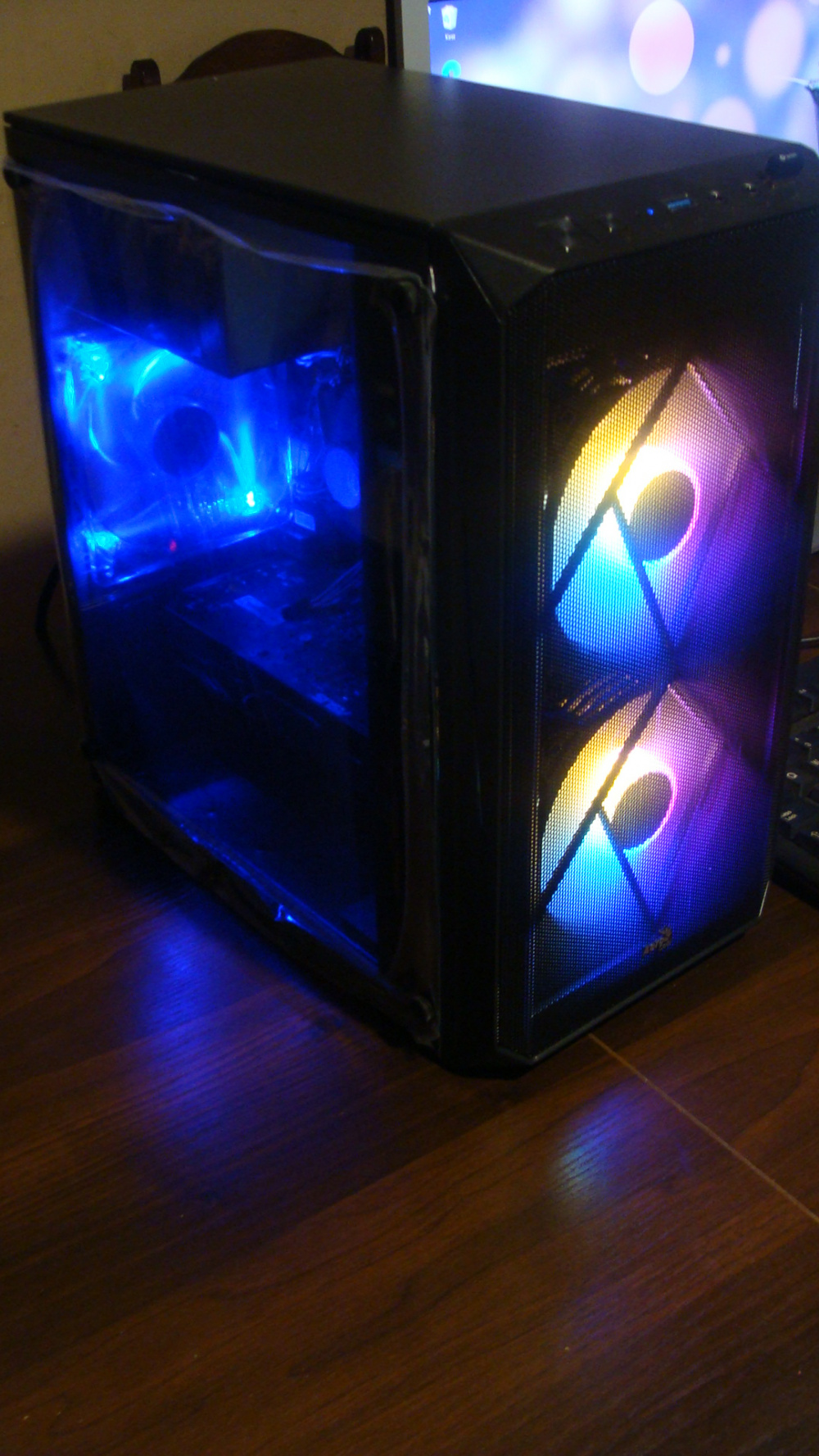 Komputer w bardzo ładnej obudowie z panelem plexi i wentylatorami LED, karton