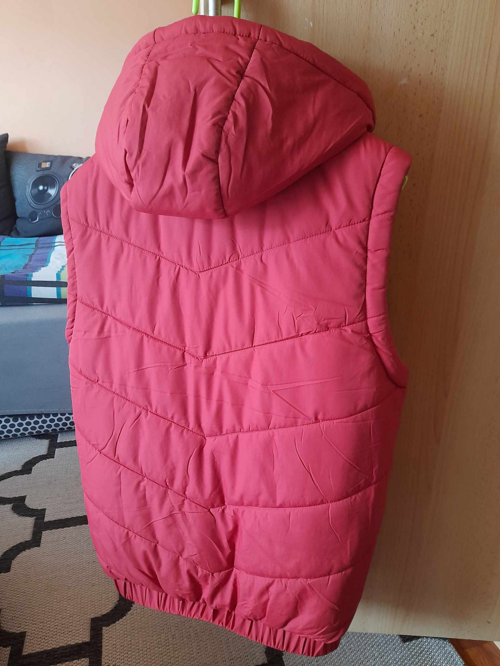 Kamizelka ocieplana z odpinanym kapturem. Regularny fason, zapinana na zamek. Dwie kieszenie boczne zapinane na suwak.