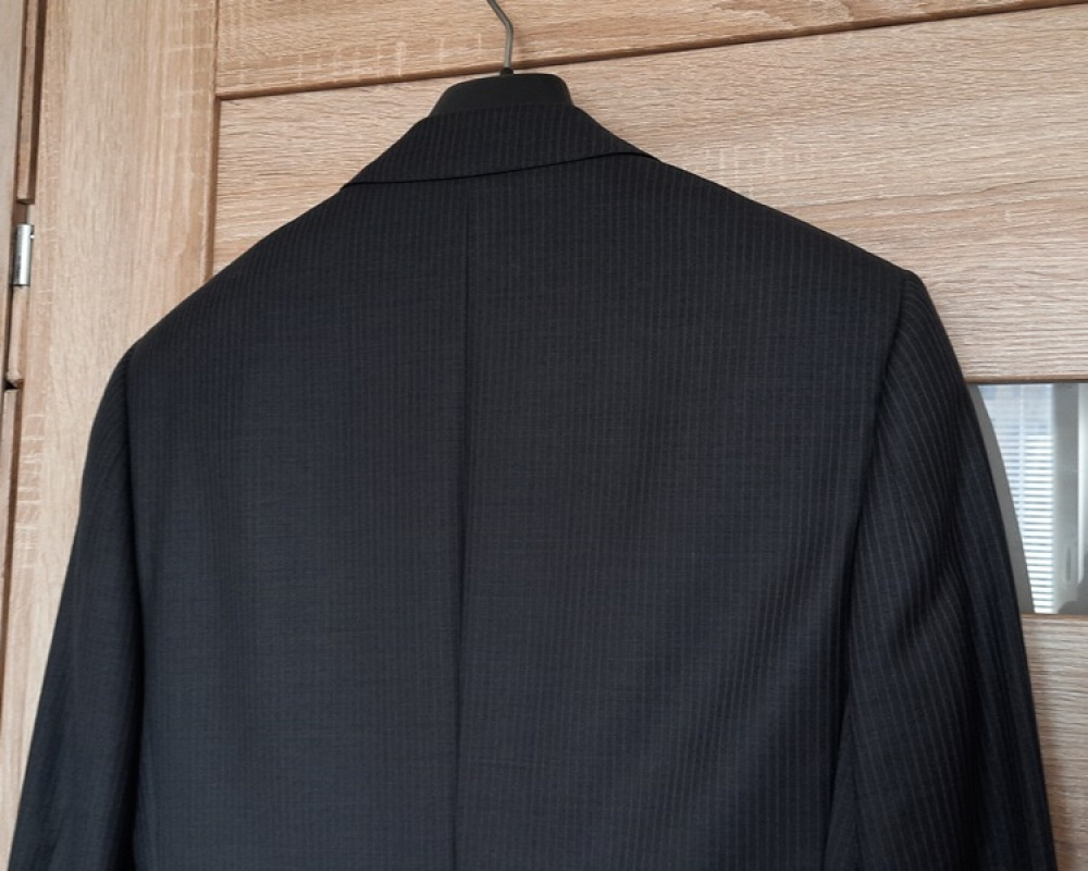 Cena 40 zł. Kolor granatowy wpadający w czarny, wełniana z 5% domieszką, na 182 cm wzrostu (182 / 96 / 82). Marynarka: długość rękawa ok. 69 cm, zapinana na 3 guziki, w klapie butonierka, kieszonka na poszetkę, dwie kieszenie zewnętrzne z patkami, wewnątrz 4 kieszenie. Całość na doskonałej jakości podszewce. Zakupi