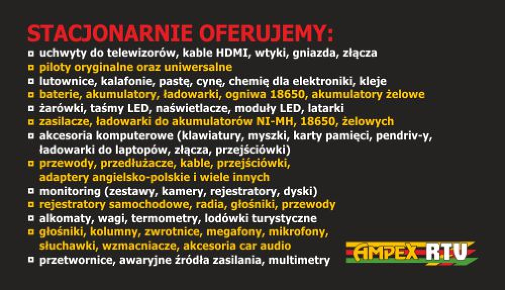 - Akumulatory m.in.żelowe, AA, AAA, 18650 i wiele innych
