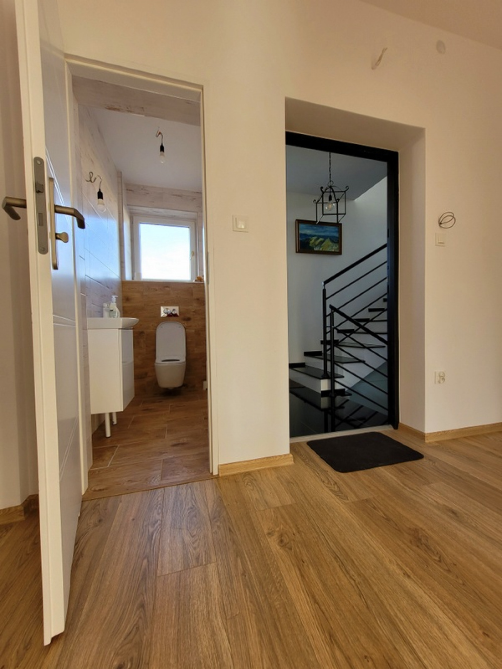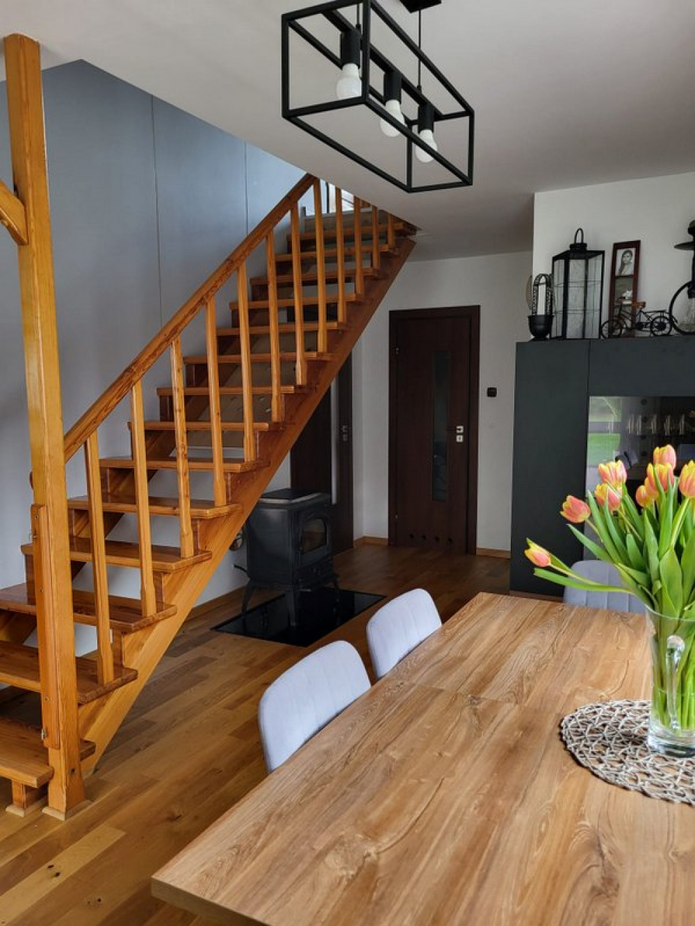 Na gorę domu prowadzą piękne drewniane schody i tutaj znajduje się: