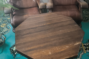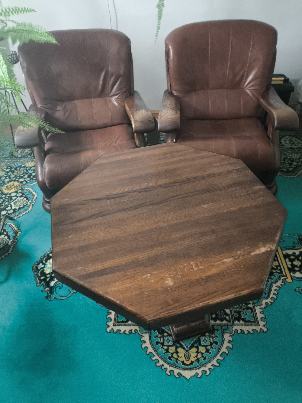 Zestaw dwóch foteli oraz stolik z drewna dębowego, styl Holenderski, stan jak na zdjęciu, możliwość kupna oddzielnie stolika i foteli