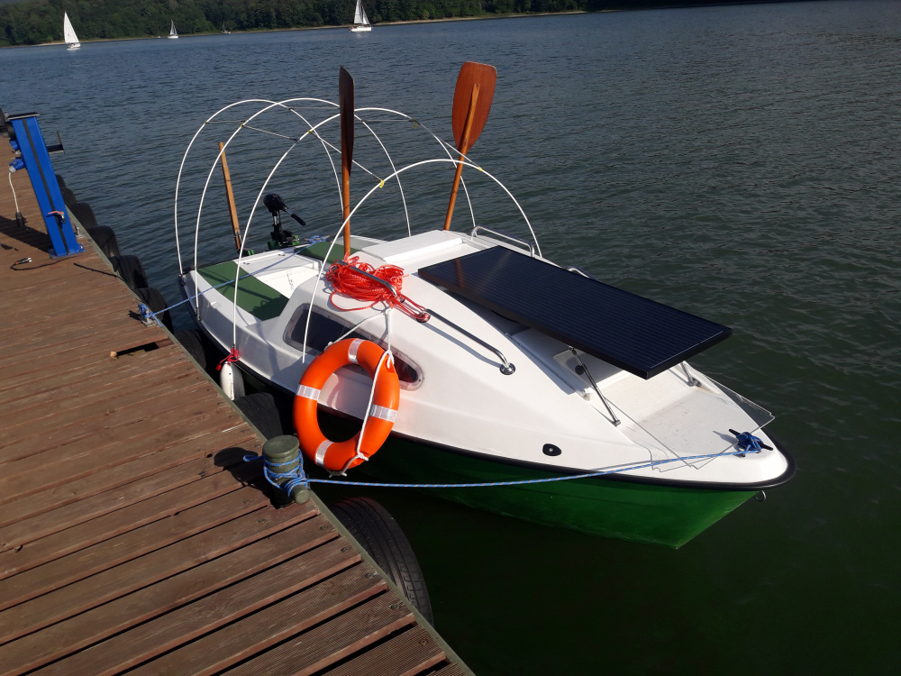 Sprzedam lekki jacht kabinowy BEZ-2 z napędem elektrycznym i ładowarką SOLAR. Dane techn: dł.4,20 m, szer. 2,0 m, ciężar ok. 300 kg, silnik elektryczny zaburtowy 12V- 60 lbs. SOLAR fotovoltaika 140 / 270 W ze sterowaniem komptr. Akumulator 100 Ah TOYAMA, oświetlenie nawigacyjne i wewn. kabiny, miecz obrotowy, zanurzenie 17 cm, 2 miejsca do spania w kabinie, materace w kabinie i na kokpicie, osło