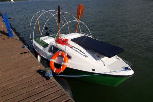 ... (pokaż całość)na (tzw. bimini) pełna kokpitu na noc, osłona p-ciw słoneczna kokpitu na dzień, pagaje inn,…. Przyczepa – wózek zarejestrowana DMC 650 kg.