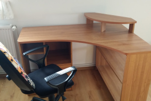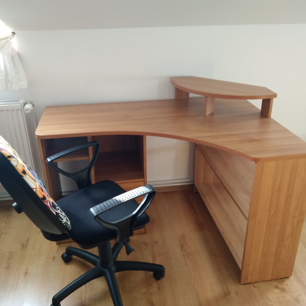 Sprzedam duże, solidne biurko narożne 135x95. Biurko posiada normalne ślady użytkowania, niepoobijane. W zestawie lub oddzielnie fotel biurowy dla dziecka (150 zł). Cena do małej negocjacji.