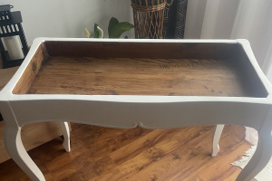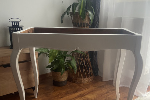 Sprzedam stolik na ludwikowskich nogach ktore zostaly odnowione i pomalowane farba matowa biala. W srodku znajduje sie schowek ktory jest zabezpieczony lakierem bezbarwnym, blat jest nowy, mozliwosc zrobienia blatu na rozny kolor drewna.