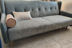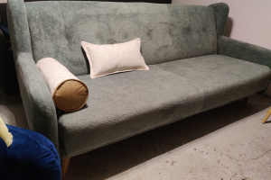 kanapa w pięknej zieleni (mięta, szałwia) w rzeczywistości troszkę bardziej zielona niż na foto. Tkanina bardzo dobrej jakości, solidna konstrukcja, nóżki dębowe