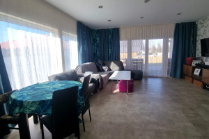 przestronny salon z dużym przeszkleniem i wyjściem na taras,