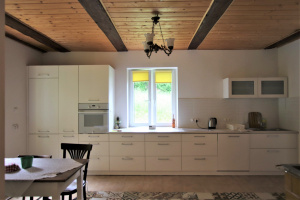 - w pełni wyposażona i umeblowana kuchnia z jadalnią, w której znajduje się również wciąż czynna kuchnia kaflowa,