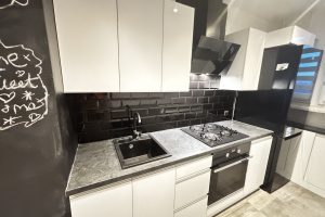 Kuchnia nowoczesna i przestronna, wyposażona w nowe meble kuchenne ze sprzętem AGD. Duża ilość szafek zapewnia sporo miejsca do przechowywania
