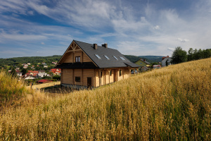 Dom wzniesiony został z najwyższej jakości bali drewnianych (14x18 i 14x20 cm), harmonijnie wpisując się w otaczający krajobraz. Architektura budynku inspirowana jest dawnymi domami z regionu, a jego usytuowanie na wzniesieniu gwarantuje piękne widoki i poczucie przestrzeni. Całość przykryta jest dachem krokwiowo-płatwiowym, pokrytym blachodachówką. Fundamenty żelbetowe, okna częściowo PCV i częściowo drewniane. Budynek gotowy do wykończenia według gustu i potrzeb nowego właściciela.