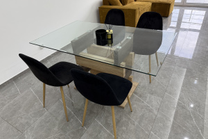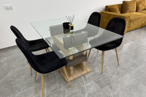 Blat wykonany z hartowanego szkła, osadzony na solidnej podstawie z imitacji drewna w dwóch odcieniach, co nadaje mu nowoczesny i elegancki wygląd. W zestawie cztery wygodne krzesła tapicerowane w kolorze czarnym, z drewnopodobnymi nogami.