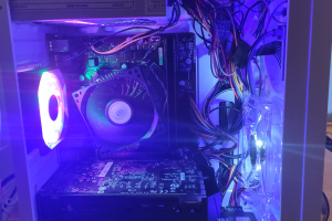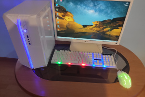Komputer stacjonarny w eleganckiej białej obudowie z podświetleniem ARGB z boczną ścianką z plexi w komplecie.