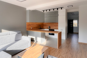 - salon z aneksem kuchennym i wyjściem na balkon,