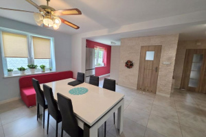 - Parter: przestronny salon, jadalnia, kuchnia z meblami na wymiar i sprzętem AGD, sypialnia, łazienka, przedpokój
