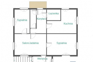 Układ pomieszczeń: 4 pokoje, łazienka, korytarz pełniący funkcję kuchni i ganek.