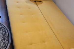 Wygodna i pojemna musztardowa sofa skandynawska z funkcją spania oraz pufa z opcją przechowywania. Wysokie czarne nóżki z naturalnego drewna. Pikowane siedzisko oraz poduszki. Dorzucę kocyki w idealnie dobranym kolorze :). Sofa i pufa są w bardzo dobrym stanie. Potrzebuję zmienić sofę na coś węższego. Odbiór w Krośnie. Pomożemy z załadunkiem :).