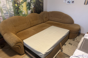 Sprzedam narożnik w kolorze jasny brąz, rozkładany, z pojemnikiem na pościel.Stan dobry.Wymiary: 160cm/265 cm Odbiór osobisty w Krosnie