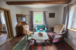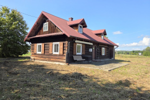 Dom drewniany o powierzchni około 70m2 plus poddasze, kryty blachą, położony na działce o powierzchni 0,3927 ha, pełnej zieleni.