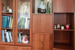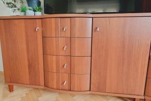 Modułowy zestaw mebli w kolorze drewna, składający się z czterech części. Mebel zawiera szafki, półki oraz szklane witryny na książki i dekoracje. Całość jest w bardzo dobrym stanie użytkowym, idealnie nadaje się do urządzenia salonu lub pokoju. Obiór osobisty.
