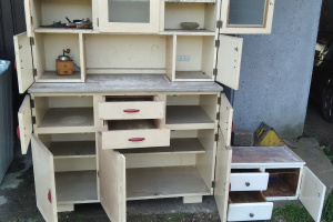 Przedmiotem sprzedaży jest zabytkowy kredens kuchenny z głębokiego PRL-u, z lat 50/60-tych XX wieku, w oryginalnym stanie wraz z szybami i naklejką informacyjną (składający się z dwóch elementów), w bdb stanie (do wyczyszczenia).