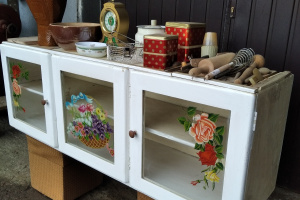 Przedmiotem sprzedaży jest zabytkowa szafka kuchenna z głębokiego PRL-u, z lat 50/60-tych XX wieku, wraz z ręcznym zdobieniem (malowaniem) szyb, w takim stanie jak na zdjęciach.