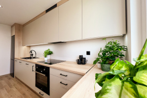 Kuchnia została zaprojektowana z myślą o funkcjonalności i estetyce – znajduje się w niej nowoczesna zabudowa meblowa wraz z kompletem nowego sprzętu AGD, co stanowi idealne rozwiązanie dla osób ceniących wygodę i styl.