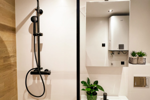 Łazienka została wykończona w wysokim standardzie – znajduje się w niej nowoczesna kabina prysznicowa typu walk-in oraz praktyczne rozwiązania zapewniające komfort codziennego użytkowania.