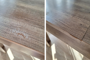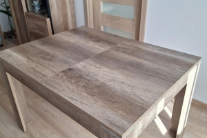 Stół, używany, przetarcia jak na zdjęciu, w niektórych miejscach odklejanie się obrzeża. Stół solidny, bardzo stabilny, dość ciężki, jak najbardziej zdatny do użytkowania przez długie lata.
